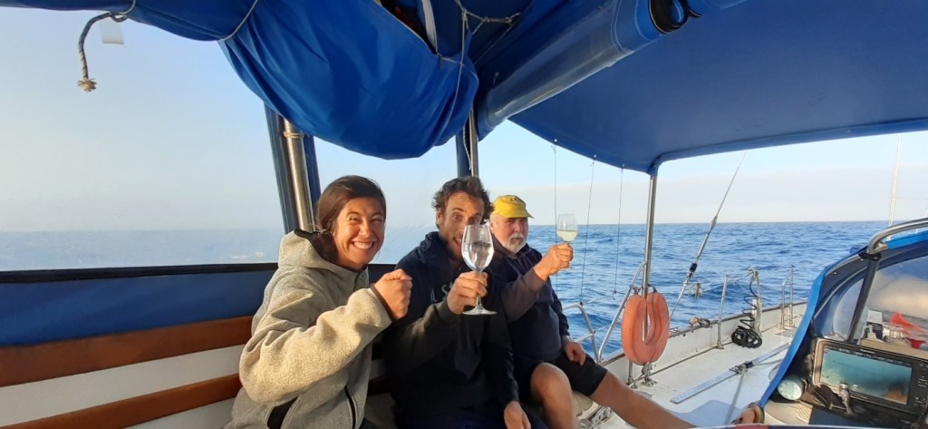 Although the bell wasn’t officially rung at 6:00pm tonight, it was clear that we’d drifted into “Sundowner Time” as we all sat in the cockpit sharing personal stories, relishing speeds of 8-11 knots over calm seas, beneath a warm sun and blue sky. Two episodes of Sailing Alone Around the World were played, stopped only by flat batteries in the mobile speaker box.