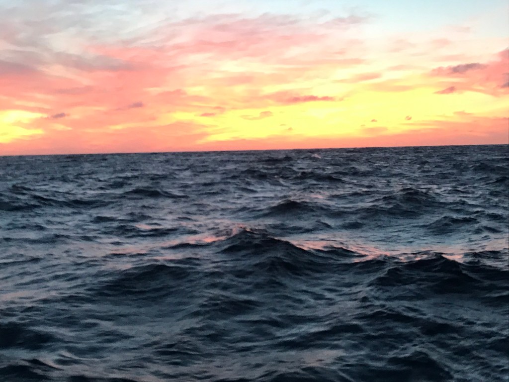 Dinner behind us, Gee dived into doing the dishes, and soon after this we were all on deck watching a large and playful pod of dolphins dive and dart around us, as the evening sky astern of us grew redder and redder. It was a sublime moment