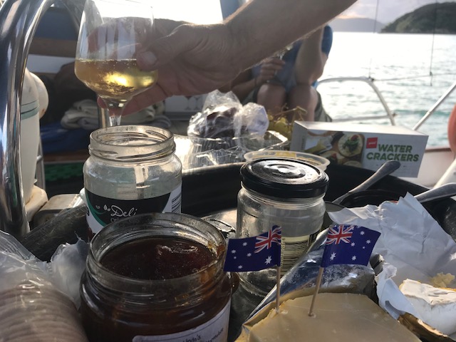Back at anchor we uber-dinghied our dear friends ashore for their 1½ hour drive home. It was then about Sundowner time and on this particular evening, a time to reflect (fondly) on the past 8 days and the sad but inevitable departure, tomorrow morning, of Dean, Sandy and Samantha. Two bottles of champagne appeared from the fridge, along with an array of nibbles and snacks, which were all consumed in the cockpit as the sun once more did its thing, disappearing over the nearby hills.