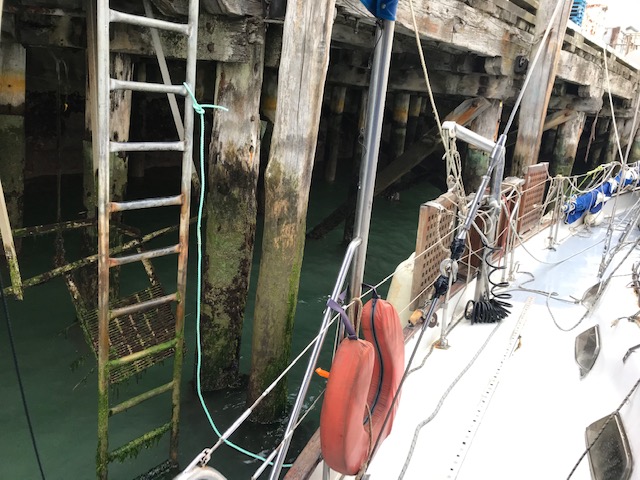 Given the choice, we prefer to tie up to anything solid on our starboard side. In this case, given the layout of the wharf, it was clearly not possible, requiring us to tie up port side (left), where we have a large wooden and steel – and rather delicate – ladder structure that protrudes out from our side. Even a quick and gentle “brush” with a solid object, could bend or break this contraption; given our 27-ton weight, traveling at only half a knot carries an awful lot of force.