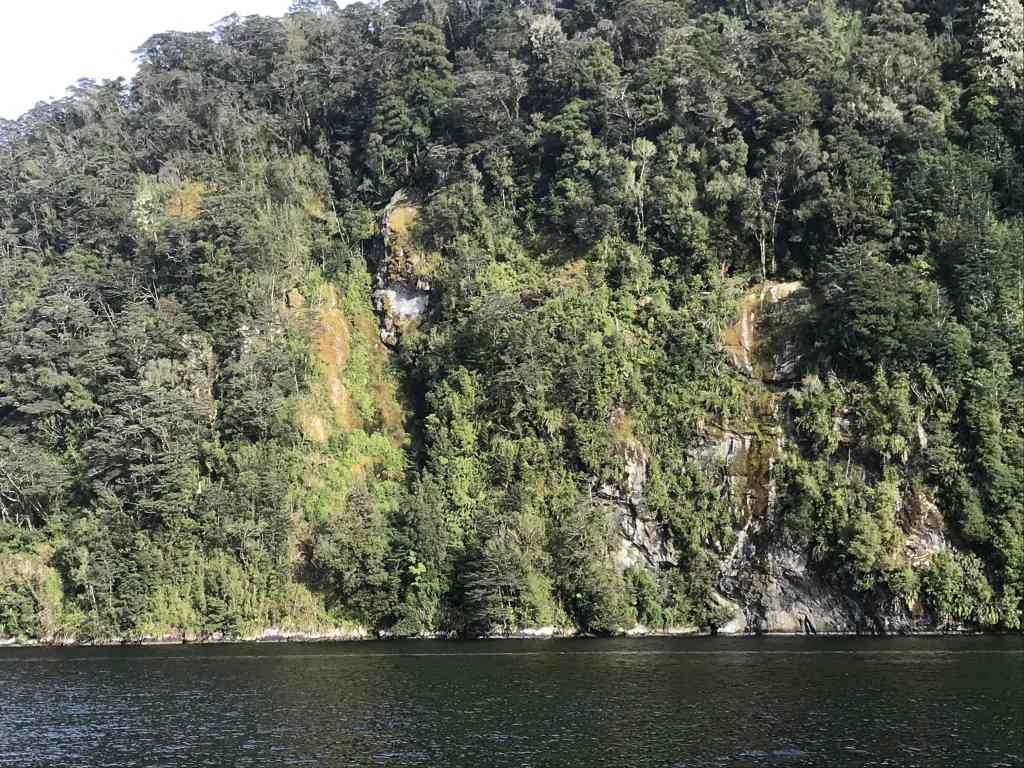 On approach to the … water pipe in the trees, below a steep tree-covered cliff, we observed that a large motor boat was already tied up at the cliff. Once we were withing talking distance, the skipper (John) explained that they were a charter vessel out of Dunedin, with passengers flying in and out by helicopter at designated spots; including Cascade Basin and Chalky Inlet.
