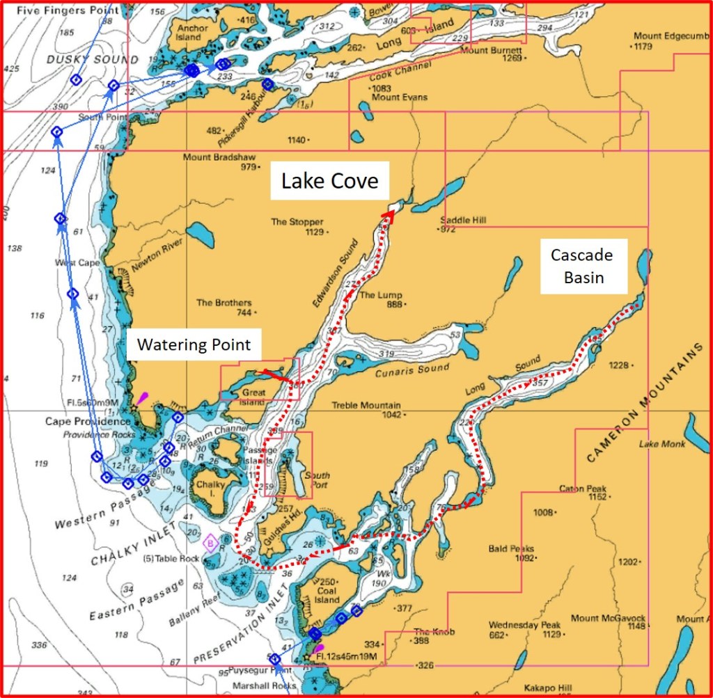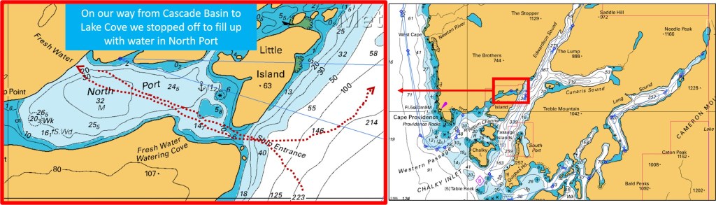 “There’s another watering point, if you are going to Chalky Sound, and it’s got a stronger flow”, the skipper, explained … and after reaching for our Cruising Guide I was able to locate it, off Great Island, in North Port, which is accessed through Ship Entrance … Got It!