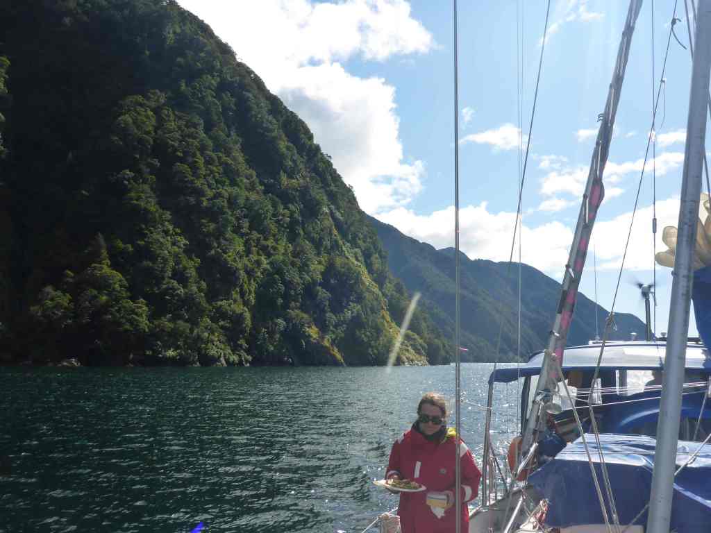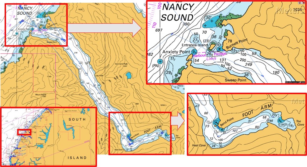 At the far end of the Sound, there is a bay called Toe Cove, then along the way there is Knee Bend, Leg Head and Heel Cove and at the other end – the entrance – there is a feature called “Anxiety Point”. Named, I’m sure, by someone who had to enter this enclosed water-way with a big, onshore sea running. The Point is just a pile of big rocks, seemingly blocking the Fiord’s opening, until you get close enough to see another pile of rocks called Entrance Island. If you’ve got this far, it’s then a simple right, then left, past Sweep Point and you’re home! As for the reference to an “arm”, this could be a little confusing until you realise it’s a reference to this branch of the Fiord – great language English!?