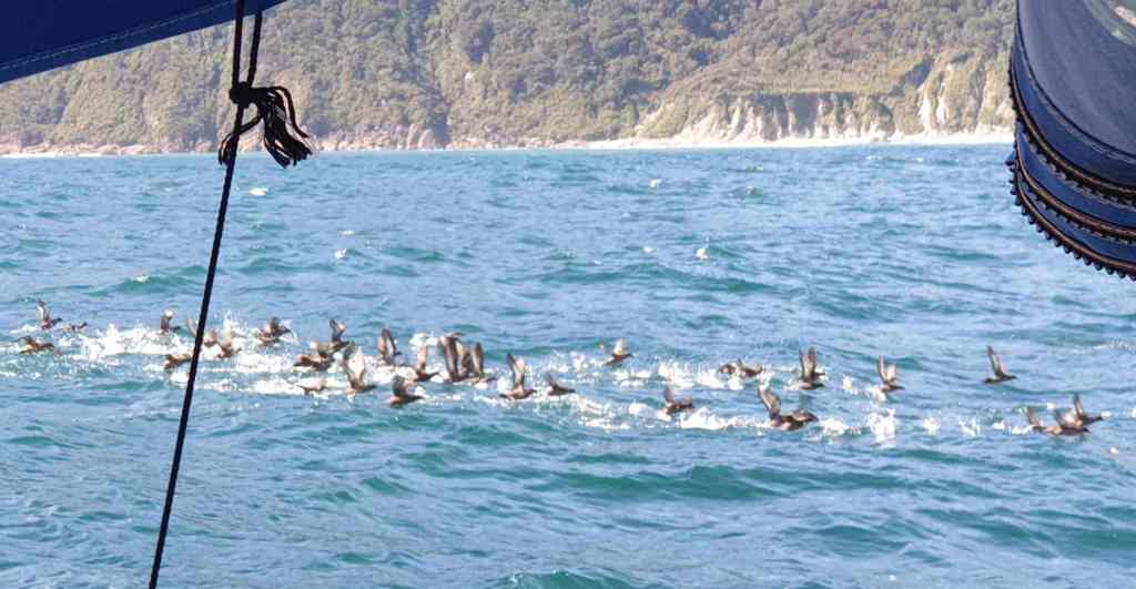 Keeping Breaksea Island on our port side, we made our way out into the Tasman Sea and set a course north. We were hoping to be joined by a promised Southerly breeze, to help push us up the coast, but this obviously had other ideas. In its place we were left with a rather rolly, uncomfortable sea, and an “occasional breeze”, mostly when we passed by the coastal opening’s to bays and Sounds, which funnelled the wind out to sea.