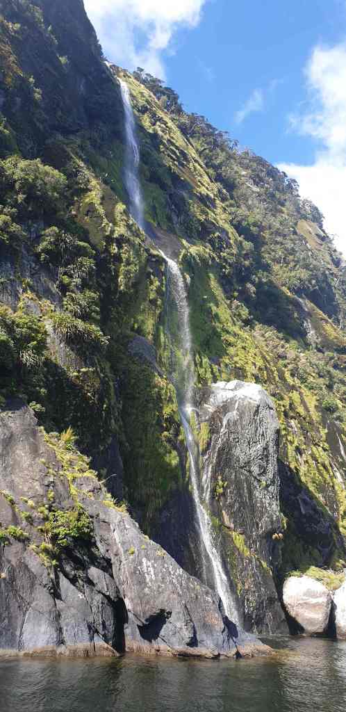 But at least the sun came out, causing us to remove our wet weather gear, as the temperature climbed. Off to our starboard side – maybe 2 miles distance, there was a progression of stunning coastal scenes, intermingled with waterfalls – the product of the recent rains – cascading down from the tree-covered hills and mountains that rose inland, almost from the high-water mark.