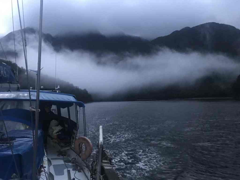 In leaving Beach Harbour, it was nice to be able to simply slip our mooring, rather than having to go through the process of retrieving the anchor. Overnight, the rain cleared, with low cloud and mist hanging low around the enclosing mountains as we made our way the short distance to the entrance.
