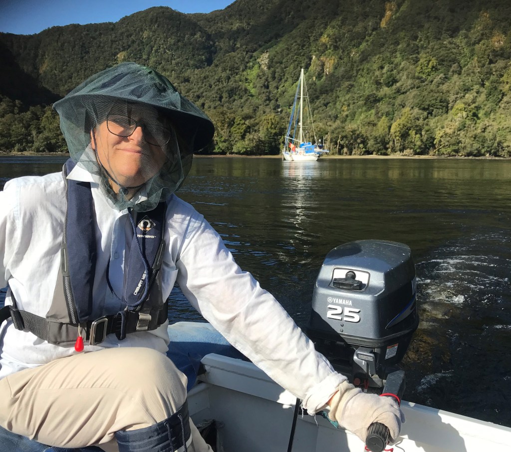 It wasn’t long before we’d launched the dinghy, with Linda and I going for a spin back up the bay as the warm afternoon sun lingered. Back on Chimere, clotheslines were hung all over the foredeck, with all the wet weather gear out for drying, along with anything else that needed an airing.
