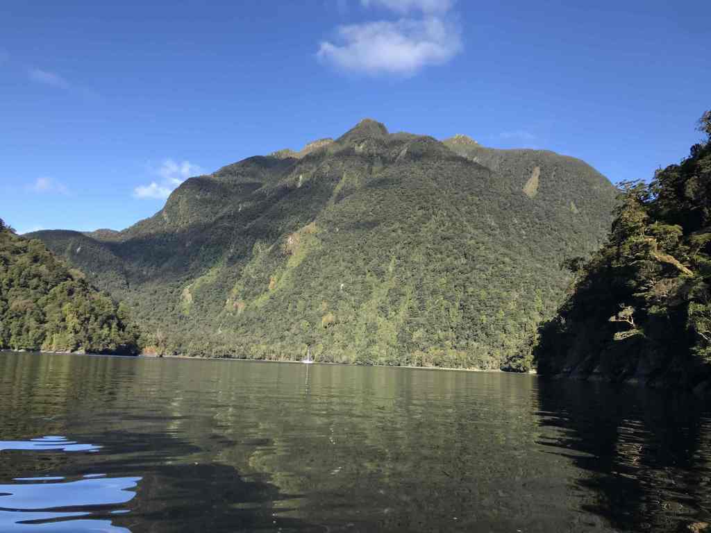 If we had more time we’d have explored each of the Fiords in turn. As it was, all we could do is tick them off as we chugged along … Dagg Sound, Doubtful Sound, Thompson Sound … then Nancy Sound; unkindly described in the Cruising Guide as, “… one of the least interesting of the fiords to visit.” All aboard agreed this was a bit harsh, with the narrowness and steepness – not to mention the beautifully still, sunny weather – making this one of our favourites.