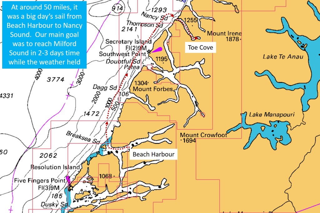 We chose Nancy Sound, after leaving Breaksea Sound 35 miles to the south, because it constituted a full day’s sail – after taking into account the additional 10-15 miles of travel, out of, and into each Sound.