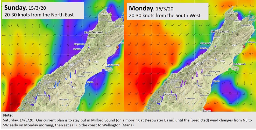 With around 430 miles to cover, we hope to spend the first night at anchor, around 60 miles up the coast at Jackson Bay (near to where the Haast Pass Rd meets the sea). Then, spend the next two days (and nights) clicking off the miles to the north west tip of the South Island – Cape Farewell – taking it in turns to stay on watch; making sure we maintain our energy levels. The longer term forecast currently looks favourable for this strategy.