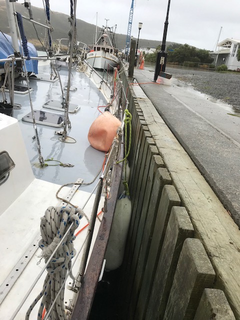 Fortunately, there was no one to see my crimes against fashion, fully decked out as I was in boxer shorts, slippers and a red wet-weather jacket, but gee it was chilly. Heeling over so much, there was also a need to lift the fenders higher so that the wooden toe-rail didn’t run the risk of touching the vertical wooden boards of the sea wall. This turned out to be a little harder than you’d expect, with the constant force exerted by the wind on the boat leaving little room to budge the rubber fenders.