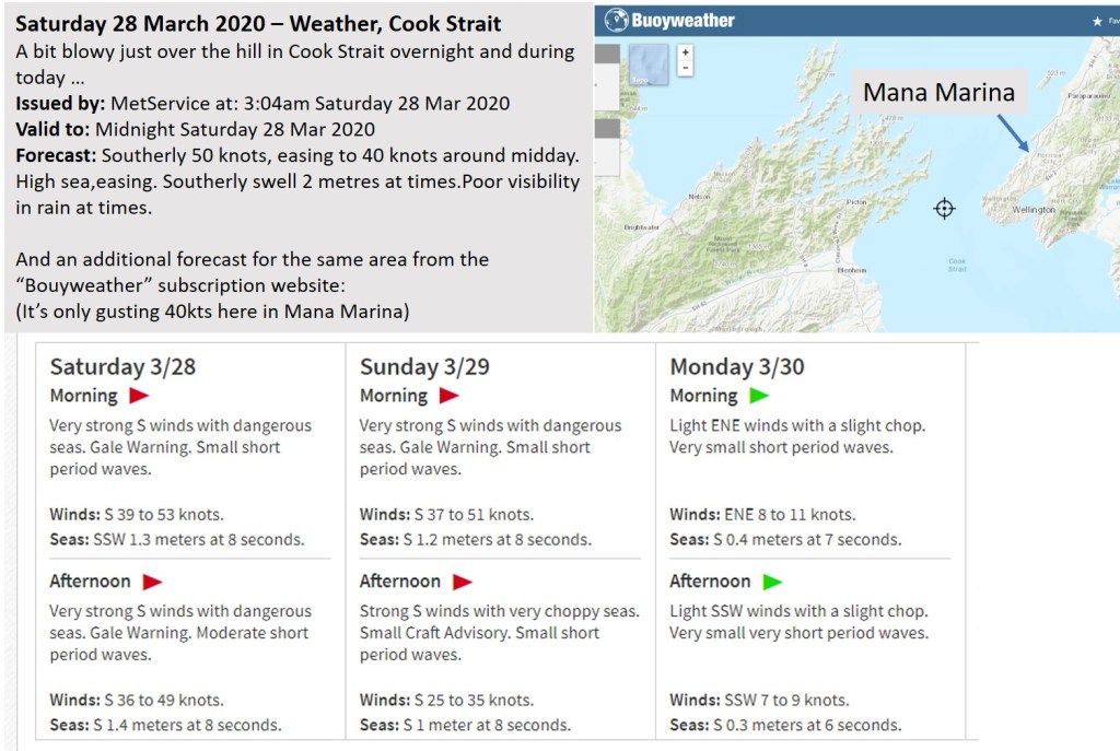 Having looked at a weather forecast a few days ago, in preparation for what turned out to be my false-start-voyage home, I knew we were in for a few days of bad weather. (Weather I had planned on shelter from at anchor before setting out into the Tasman Sea) But the 50 knot Storm Warning that was issued for Cook Strait very early this morning, came as something of a surprise; not to residents of Wellington of course, that’s how the place got its name after all … “Windy Wellington”.