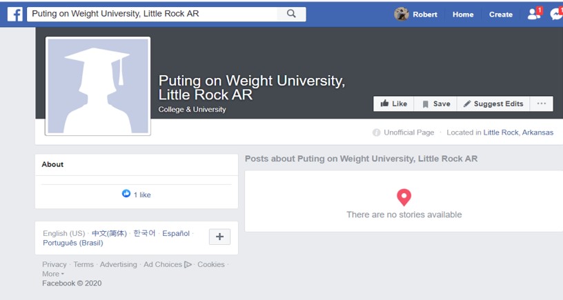Obviously, this isn’t something that deserves too much thought, but of course with just a couple of clicks you can end up at THEIR Facebook page. Which curiosity did of course. And in this case, under the heading “Intro” … I see that they studied … “Fat at … Puting on Weight University, Little Rock AR”