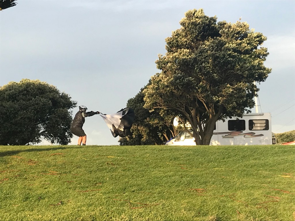 “Rollerblade Man speeding on road holding two parachutes in 30 knot gale”.