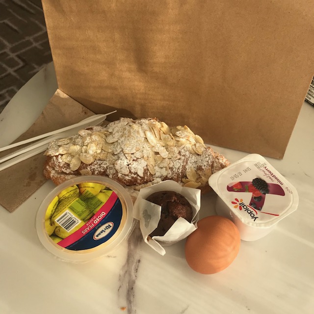Breakfast arrived, as the Pan Pacific Hotel Information Sheet stipulated, between 7:30am – 8:30am with a knock on the door. Probably in a kind of a … knock-drop-and-run routine … because no one’s there when I open the door. And it doesn’t take me that long to get to the door. There’s just a boutique brown paper bag. I’m starting to build up a nice collection of classy brown paper bags with raffia handles – all neatly folded in the corner, under the cabinet, on which sits a very large flatscreen TV … or, it’s probably called something like an “Entertainment & Communications Hub”