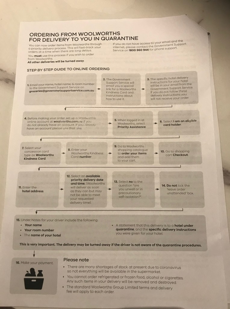 The Government Support Service sounds like a pretty amazing outfit. They’ll also arrange care for my pets … if I had any (sorry Linda, that’s not you) and will send me details of a supermarket ordering website-link which Woolworths calls a “Kindness Card”. Not so “kind” that you don’t still have to pay for what you order?! It’s all fully explained in a 16-Step full page flow diagram … Simples! I’ve emailed my request to the relevant department and I’ll report back on progress.