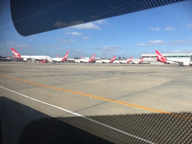 There are a lot of Qantas planes out on the tarmac. I counted 4 of the big A380s, plus another 20 or so smaller craft