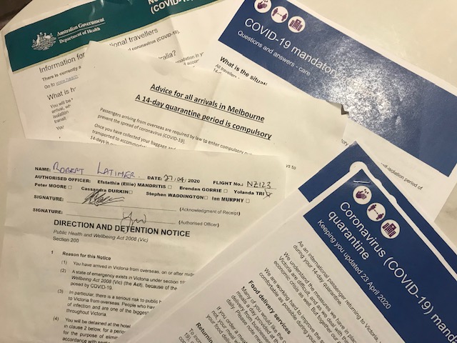 Reading through all the paperwork involved in being “quarantined”, one form was a “DIRECTION AND DETENTION NOTICE” under the Public Health and Wellbeing Act 2008 (Vic) Sec. 200 – this form I was required to sign, in order to accept the terms of the compulsory detention.  Not sure anyone was in the mood for me to ask … “mind if I run this by my solicitor…?”