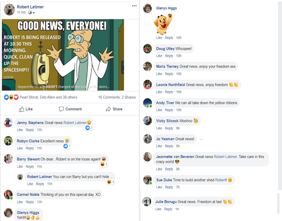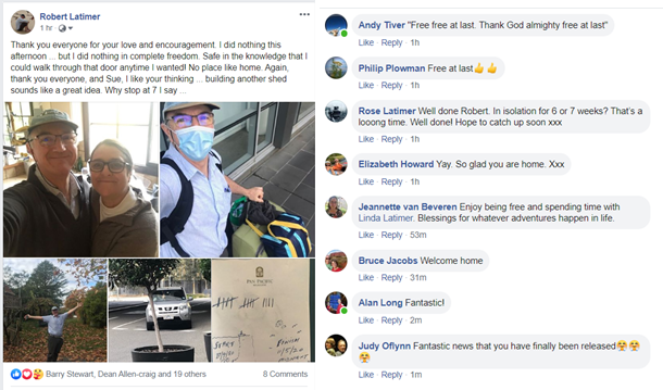 “Hi guys”, I said to the larger group of police, as Craig came to escort me “off the premises”.   “Happy to be going home?” called one officer … “Is that a question, or a statement?” I jokingly replied. Yep, definitely they weren’t here about MY Facebook Post. Either that, or my face-mask and nonchalant manner fooled them