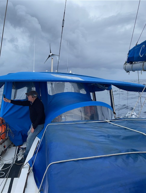 On the UP-side, we have had the wind mostly going our way and the seas, whilst in the 3-4 metre range are not on the bow, but more from the beam or stern quarter. This makes for a rolly kind of action, with a permanent heal to port, (which is great for sleeping my bunk) with the NW wind of around 20 knots coming in over the starboard side. Our course is currently SW – as you should be able to view on the Tracker – which is roughly the direction of southern Australia – that’s what my Jacaranda Atlas says anyway.