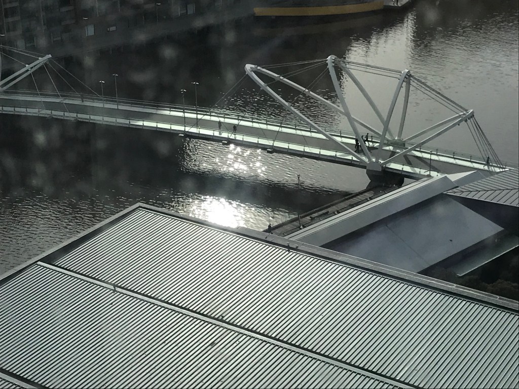 The photos illustrate that I covered some ground … in particular I had a closer look at the Polly Woodside museum- ship and pedestrian bridge that sit beneath my 12th floor window. The near-full moon was also coming up and it looked rather special as it rose between a couple of tall buildings. At least there was no dirty window to blur the view.