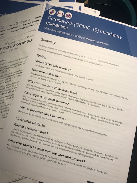 Around 10:15 I was saying good buy to my room, with my bags being taken down in the lift on a hotel baggage trolley, just like I was checking out for real. At ground level, I made my way to the first of two temporary desks near the hotel reception and provided my original Detention Notice, plus photo ID. There was only one person ahead of me and as I made small talk with lady behind the desk, it was evident that every-one had their particular “story”, including a chap who had just left who was on his way down to Tasmania, where he’d be doing another two weeks in isolation there.