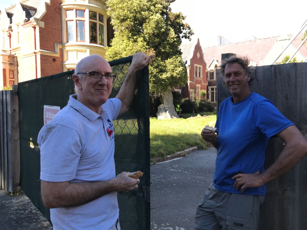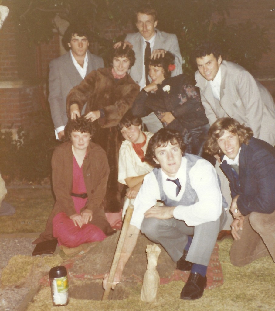 2018, and our wry smile and casual manner was because it was ONLY ground staff who were allowed behind the earthquake barriers … to dig in search of the time capsule buried 15 years earlier. After nearly 2 hours of digging, and a very big hole, the groundsman gave up and handed in his shovel. What were we going to do? We hadn’t all come from around the world, after 15 years, to be told, “sorry mate, we can’t find it” After returning to the workshed with the “retired” groundsman, somewhat downcast, we asked … “what’s involved in getting approval to go behind the earthquake barriers” … The answer … “you need to wear these flouro vests and be supervised” We asked the wornout groundsman … “are you happy to supervise us?” The answer … “Yeh, no worries bro, I just can’t dig anymore” Result … it took us about 10 minutes to find the treasure in a slightly different spot to where our helpful man was digging … then another 10 minutes-plus to fill in the enormous hole. Here’s Linda, my long-suffering and ever supportive wife, plus me , holding up the prize. May 1982 – We buried our first time capsule late at night following our graduation dinner. (to be opened in May 2003) Linda took the Photo. That’s me with the shovel, and John Land in the blue jacket next to me. On the grass is a bottle of port and a container holding our future written dreams and plans. – both of which survived the test of time. and were duly dug up after 21 years , at the 125th anniversary of the university