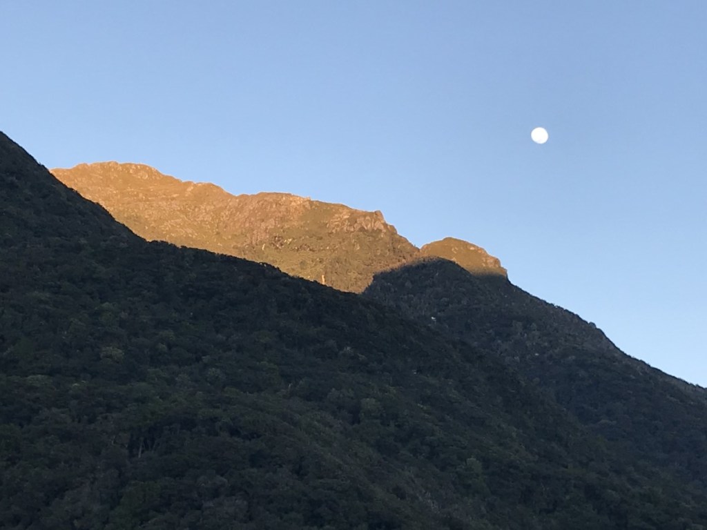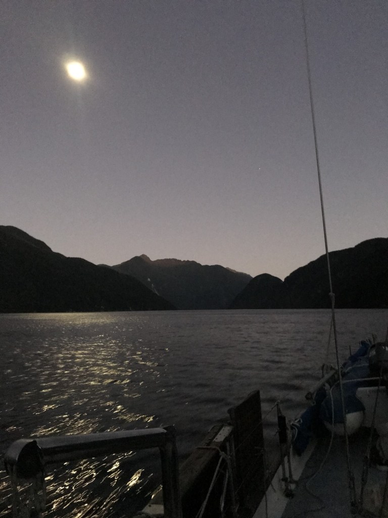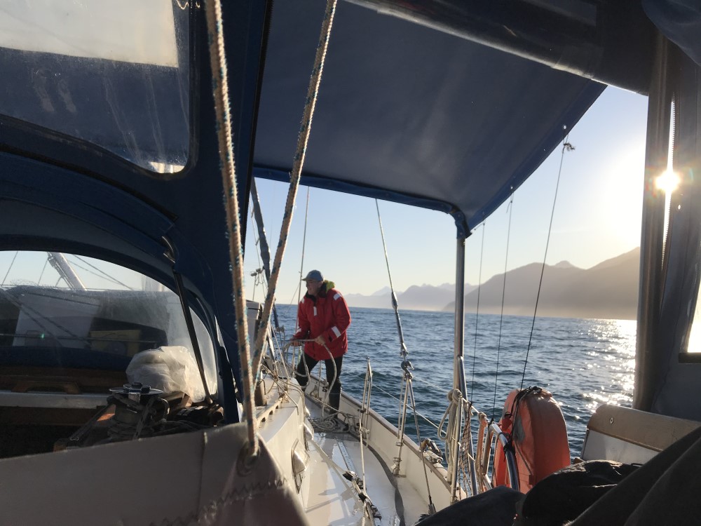 After departing Jackson Bay at 5:45, making sure not to snag any boat moorings in the dark, we made good progress up the coast, with the wind gusting up to 30 knots, blown down off the mountains (of ever-increasing size) on our starboard side.