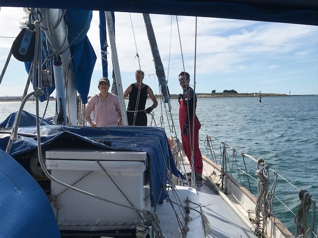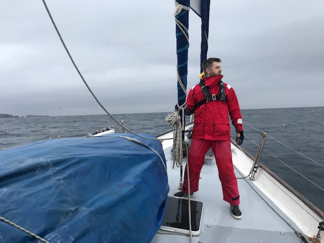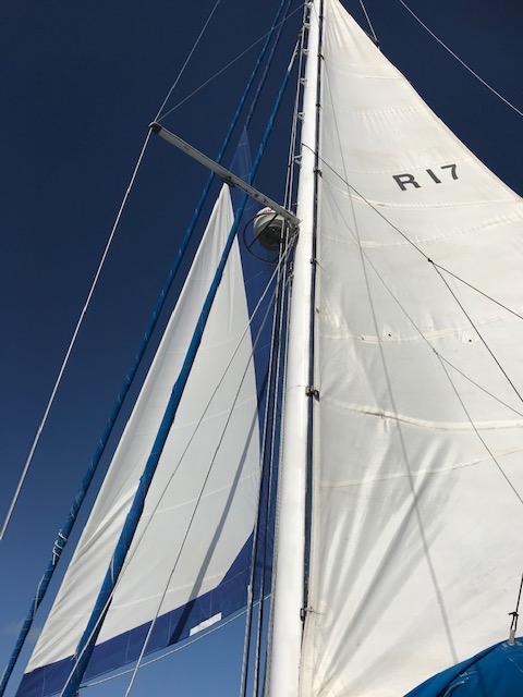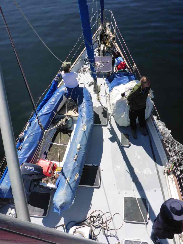 The sails now patched up, we got away late afternoon, under double-reefed mainsail and tiny jib; the wind having died away considerably. The forecast predicted this and that the wind would continue to abate to almost no wind by nightfall.