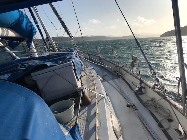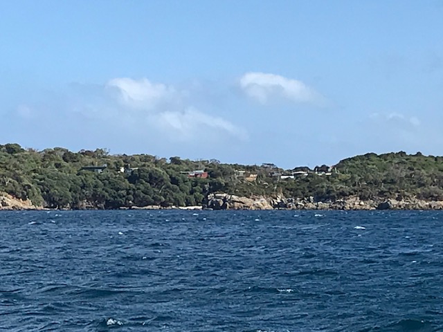 Not a lot of sail hoisted, but still we made 8-9 knots up the coastA few small holiday huts could be seen on the remote island that guards the entrance to Port AdventureAt least the seas were not so rough and the sky clear