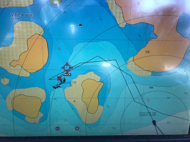 Shortly after, while I was having a snooze in the saloon, the sound of the anchor alarm could be heard. Or was it a fire in the galley – both alarms sounding very similar – no, it was definitely the anchor. The problem being that a light afternoon breeze from down the Sound, had spun us around. So, whilst the anchor remained in 10 metres of water, Chimere was now in about 2-3 metres of water; facing out of the Sound, instead of in.