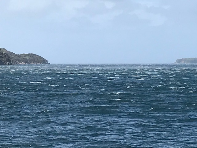 It was a very different story, however, once we rounded the headland into Paterson Inlet and set a westerly course to cover the final 4 miles. Without the shelter of the land, the wind simply howled across the water slowing our progress to a crawl, tacking this way and that to gain some lift from the mainsail; the jib being earlier wound up completely. Mostly sitting at 30 knots, or more, gust occasionally hit 40 knots, with the only saving grace being that the seas weren’t too big, oh, and it was also sunny.