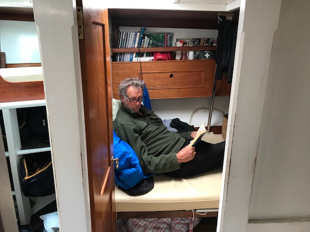 John relaxes insideCarsten finds a comfy spot in the cockpit to read and relaxOur latitude clearly shown on the chart plotter as 47 Degrees SouthWe were sad to be saying good-bye to Port Adventure