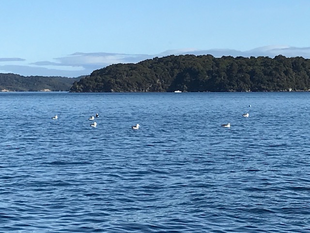 We did a double-take at the sight of a huge cruise ship around the point in Paterson Inletwe had the islands of Faith, Hope and Charity on three sides and the shoreline on the fourth Just a glorious morning. The multitude of moored boats were off our stern Our departure from Stewart Island was over mirror-calm seasBy cruise ship standards, I suppose this one is rather small