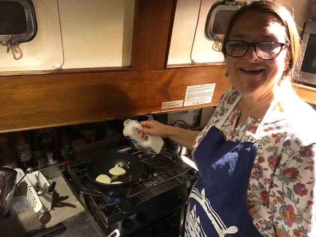 Domestic noises could be heard from the galley, which resulted in Linda – supported by James it must be said – producing a wonderful dinner, backed up by a steady stream of pancakes, which we covered with anything unhealthy we could find.