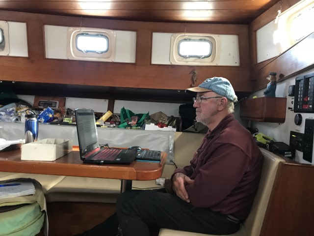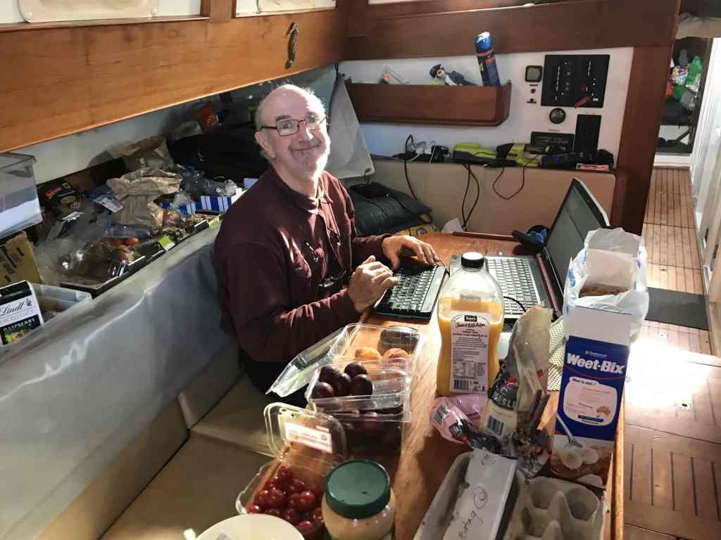 Leaving Paterson Inlet, the chart plotter tells a few stories … the zig zag line of our slow entry the afternoon before, our straight exit over calm seas, and the large icon of the cruise ship and two of its tender boats going to and from the shore.A very calm drive across Foveaux Strait A good chance to catch some ZedsJohn catching up on some eating … time for second breakfast …John keeping watch. Still a bit of a roll aboard with the remains of both a SW and NE swellCarsten finds three-bars on his smart phone
