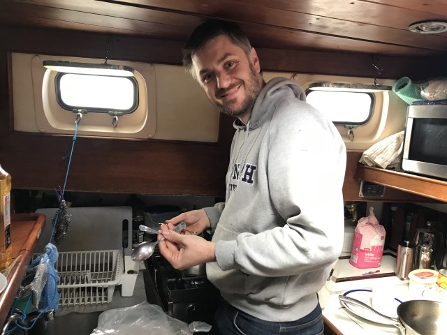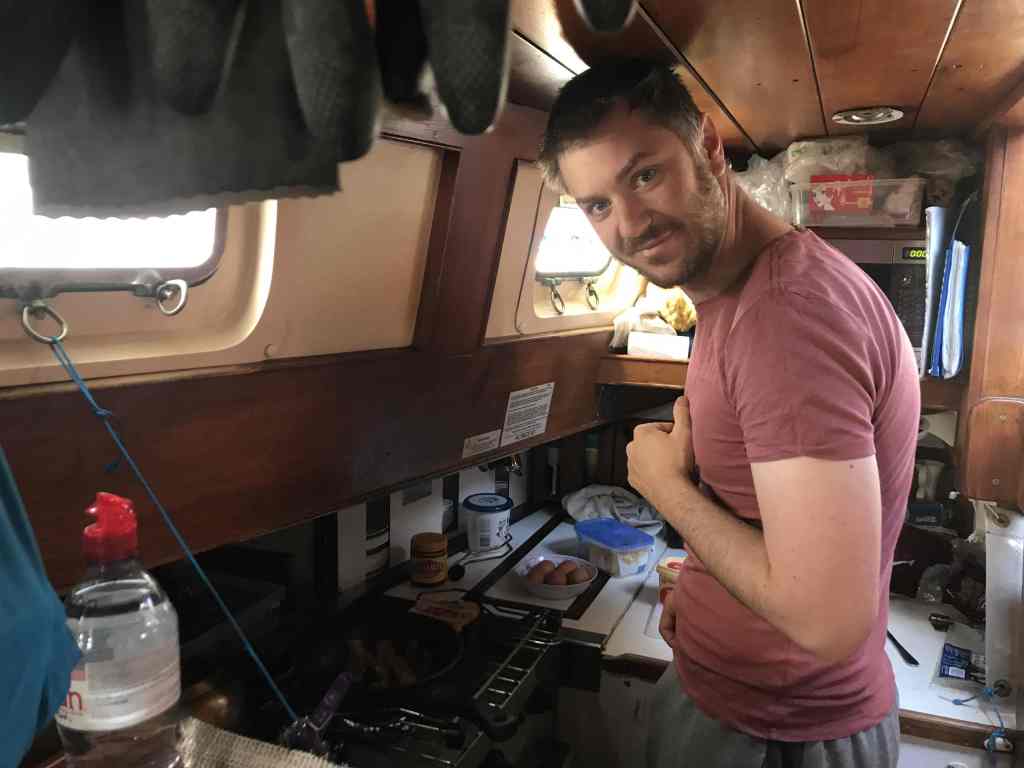 Linda in the galley – pancake time!A peaceful, reflective moment … the natural light giving both Matt and James an ethereal look…Tired puppy … more the lateness of the hour than anything a sip of Kraken could inflict