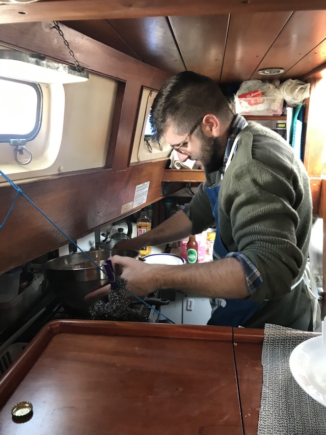 In order to maximise the value from the crayfish we’d acquired, James took a blow for the team by spending what must have been 4 hours or more in the galley, cooking, cracking and cleaning the critters; one at a time. We have a large cooking pot, but clearly not big enough to accommodate more than one cray at a time.