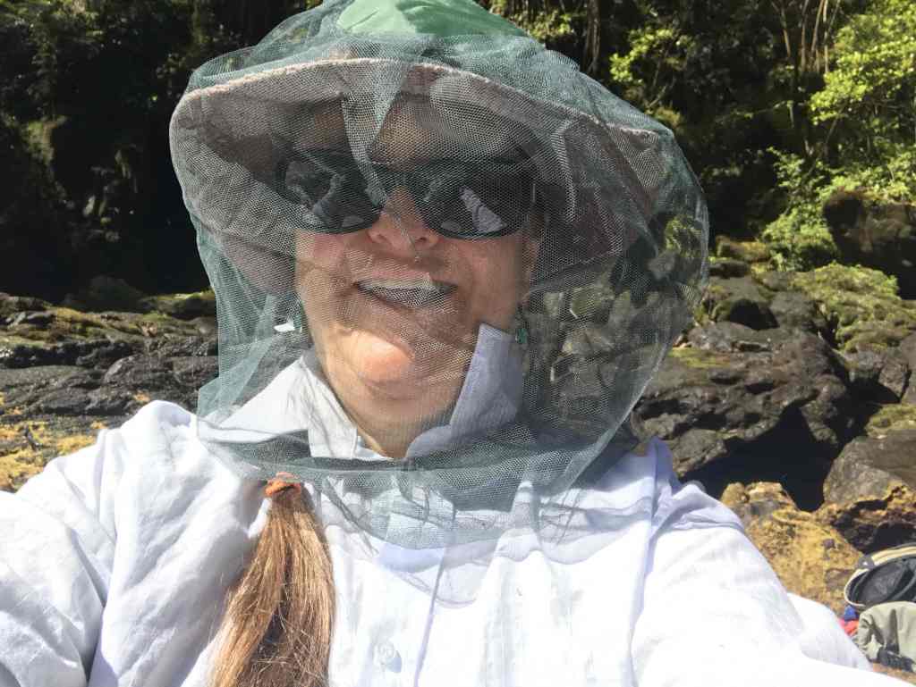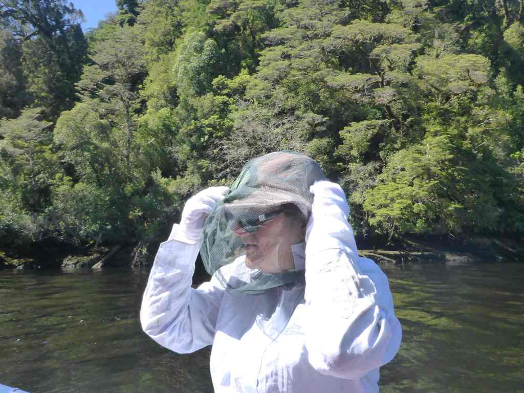 The end of Long Sound and our anchorage for the night, Cascade Basin Fiordland Fashion … the Outback-Sand-Fly- Defense motif …Linda had it sorted … Total sand fly body protection … Linda came well prepared Chimere was anchored just a few 100 metres from the waterfallThe waterfall soon came into sight … and the roar spoke of a serious torrent James, the master of the selfie, gets us all in the frame Landing among the rocks at the base of the waterfall After getting ashore from the dinghy it was then a short walk over moss-covered rocks to the fast-flowing pool at the base of the thundering waterfall It was invigorating to enter the cold water, but also to be so close to the power of this thundering force of nature