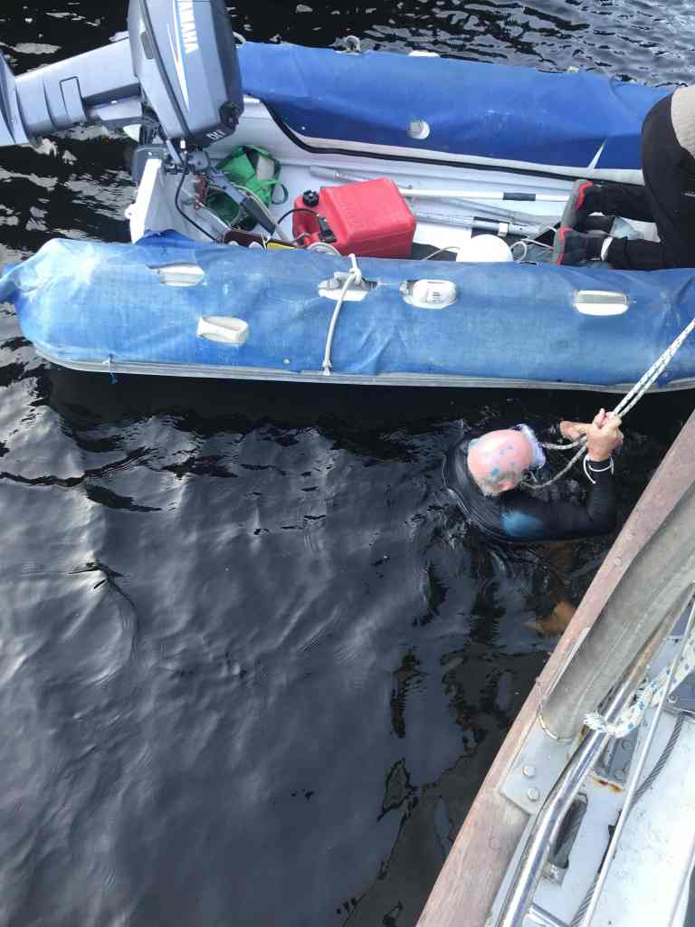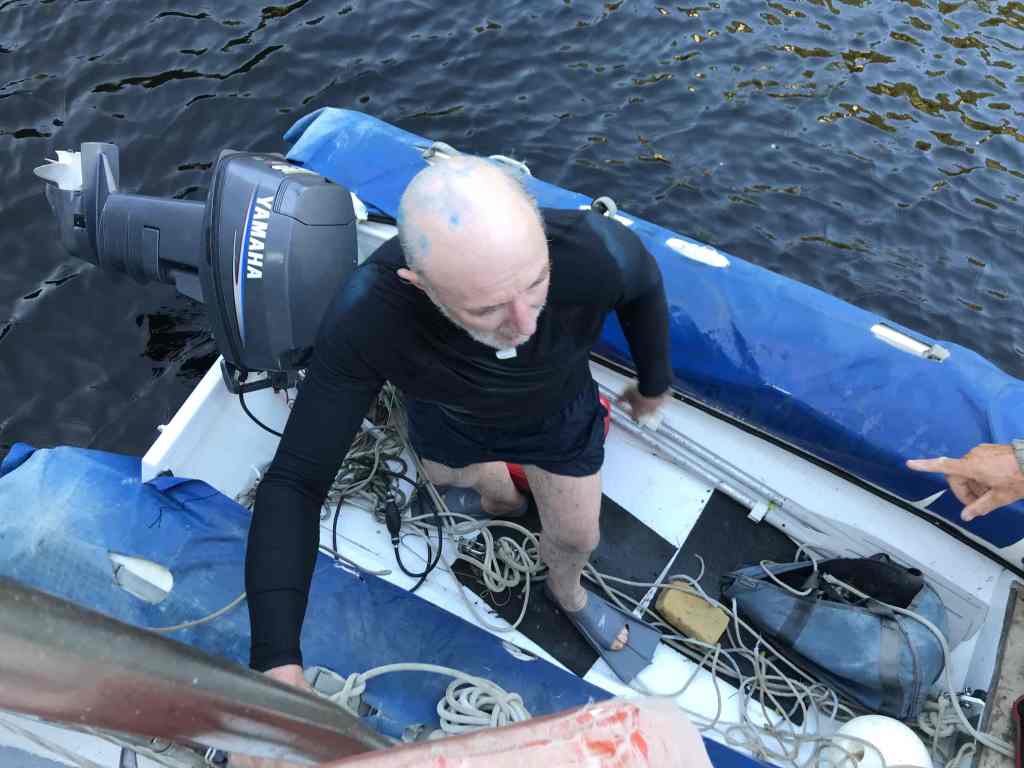 A swim, late in the day was not on my agenda until a line got wrapped around the propeller – note the white foam float and rope in the dinghyLooking like he’s been infected by the blue-bonic plague , Rob cuts the last of the rope away from the prop after several “duck-dives” in the chilly waterThe anchor-float is supposed to make things safer … but when the line gets around the prop. it’s anything but! Won’t let that happen again. Time to come aboard and warm up
