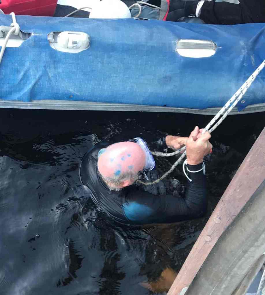 So that’s how I got my second swim for the day. Although, it definitely lacked the “recreational element” of the first swim, as I struggled to fill my lungs with enough air to dive down as far as the propeller. The water was as chilly and brown as before, and after fifteen minutes and maybe five or six brief duck-dives with a sharp knife, I could finally declare, “got it!” as I handed the remains of the rope up to John in the dinghy.