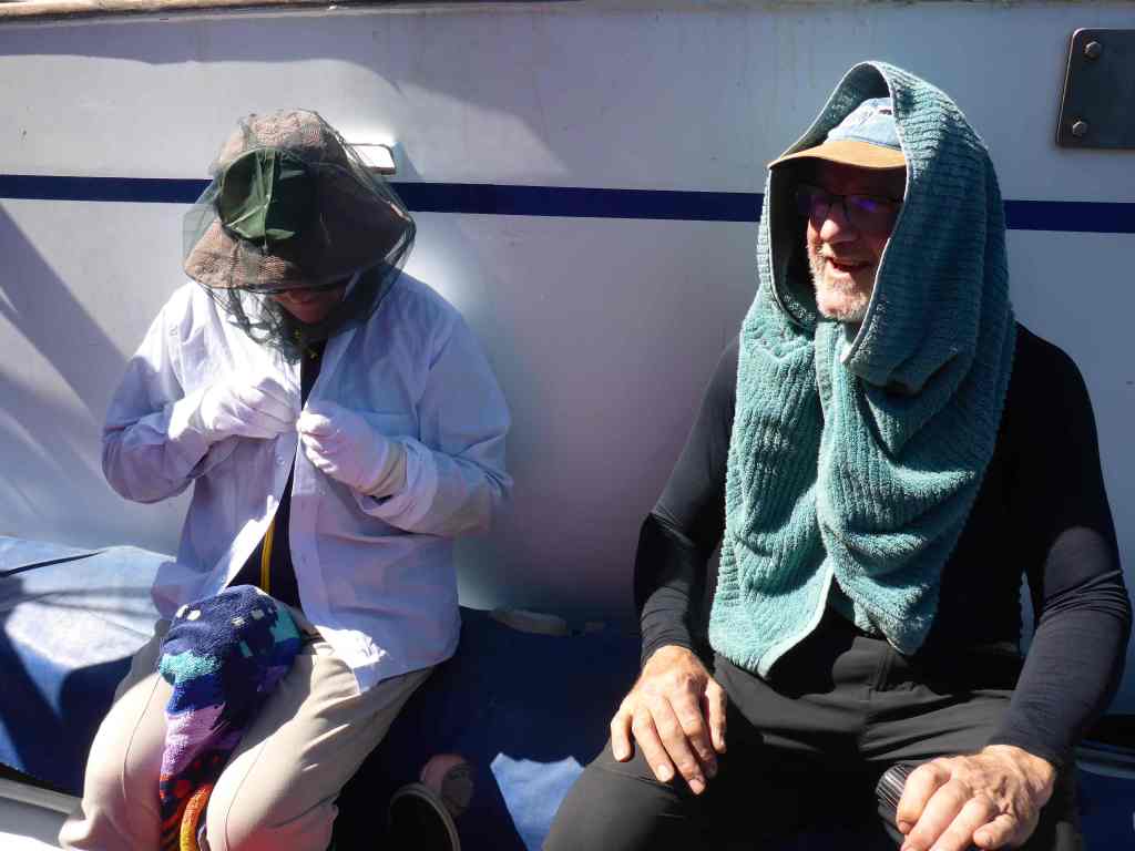 Once aboard, it was a case of warming up in dry clothes, before re-anchoring a bit further out in the Basin, where the last of the day’s sunshine still shone, and where we all agreed, the sand flies would have greater difficulty reaching us.