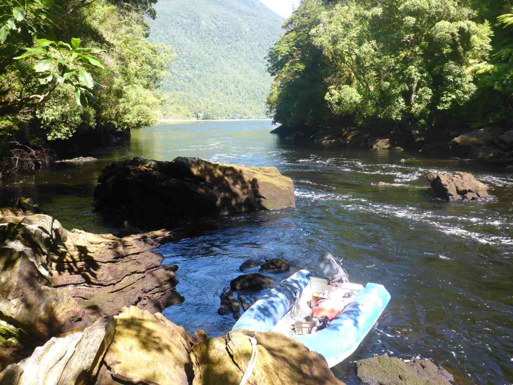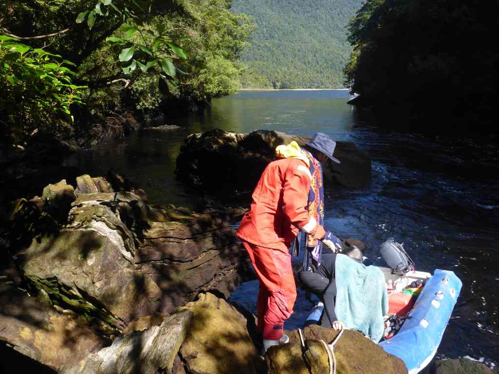 On approach to the … water pipe in the trees, below a steep tree-covered cliff, we observed that a large motor boat was already tied up at the cliff. Once we were withing talking distance, the skipper (John) explained that they were a charter vessel out of Dunedin, with passengers flying in and out by helicopter at designated spots; including Cascade Basin and Chalky Inlet.