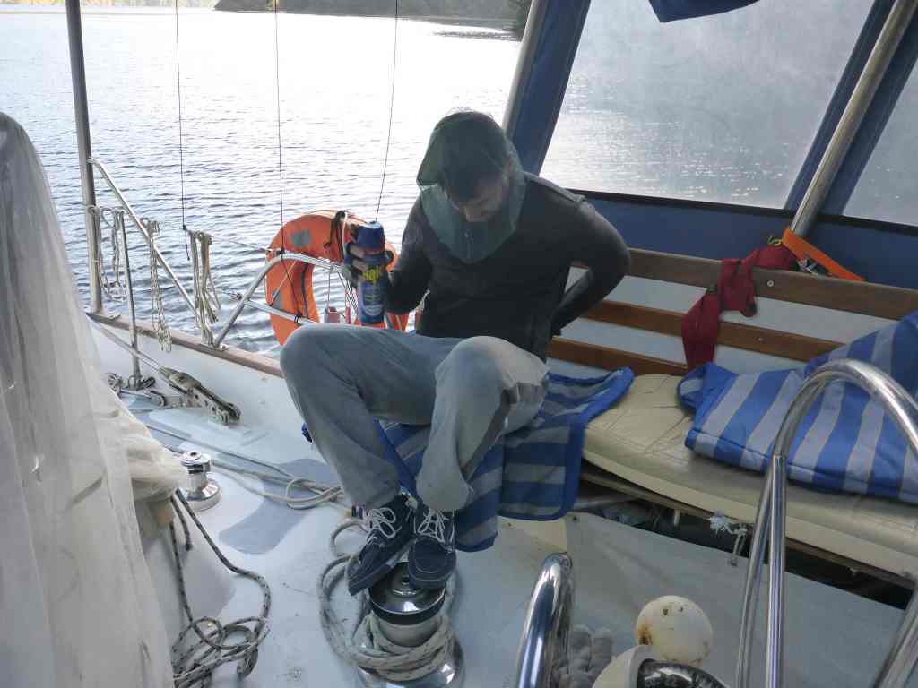 After much waving and group-hugs all round, we saw Carsten off, leaving John and me rattling around aboard Chimere, ready for our second-breakfast, and wondering which task to undertake first. The winch still needed to be dismantled, there were broken cockpit-cover-tiedown clips to fit, two window covers to attach, plus the essential “shop-up”. With Linda, Matt and James arriving this evening, for our 2-week jaunt around to Fiordland, there was a need to re-stock the pantry in preparation.