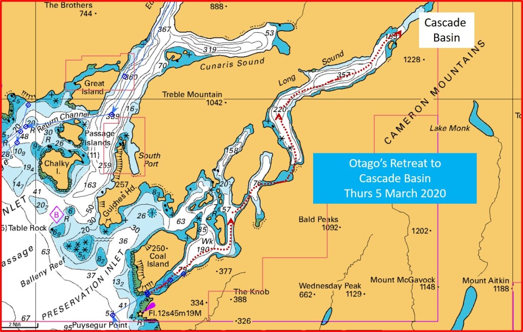 Dinner was another wonderful fish ensemble, with everyone retreating to bed early. Tomorrow we plan to be away by 9:00am, with the waters of Chalky Sound, a short distance to our north, beckoning.