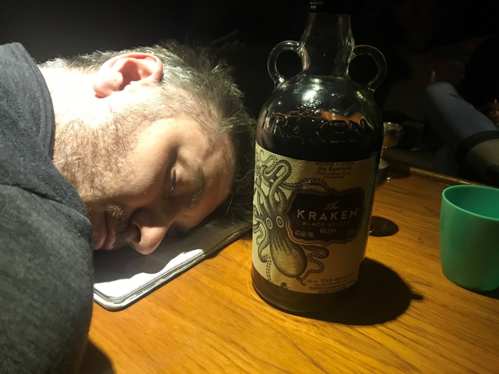 Back on board, after our celebratory “arrival dinner”, the excitement of the first night aboard kicked in, with James also pulling out his duty free bottle of … “The Kraken Black Spiced Rum”, complete with references to “Bizarre R Fierce Sea Creatures” … a most suitable “night cap”, capable to clearing out the sinuses, along with many other things besides.