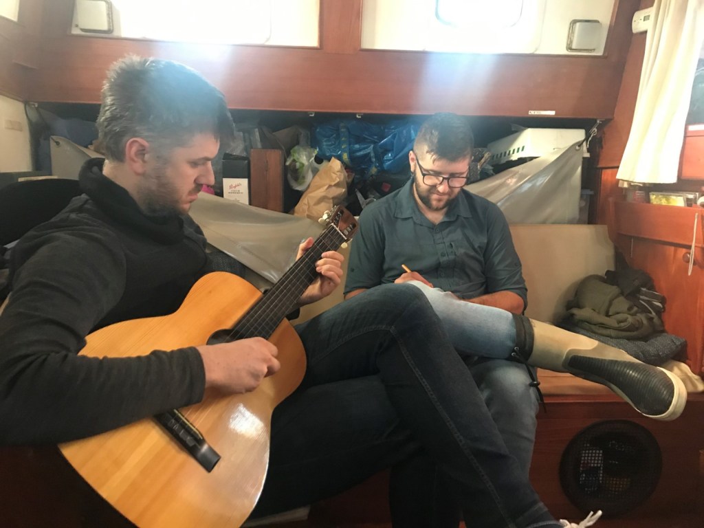Tr: Otherwise, life on board is totally relaxed. Rob and John are in a good mood and always have a funny saying ready. The three of us get on well straight away.