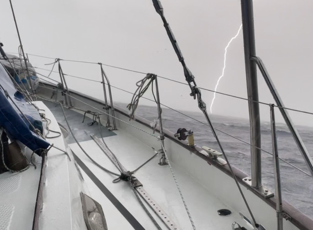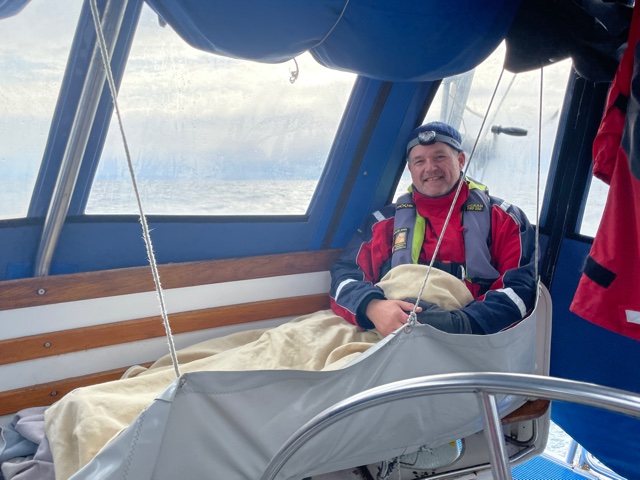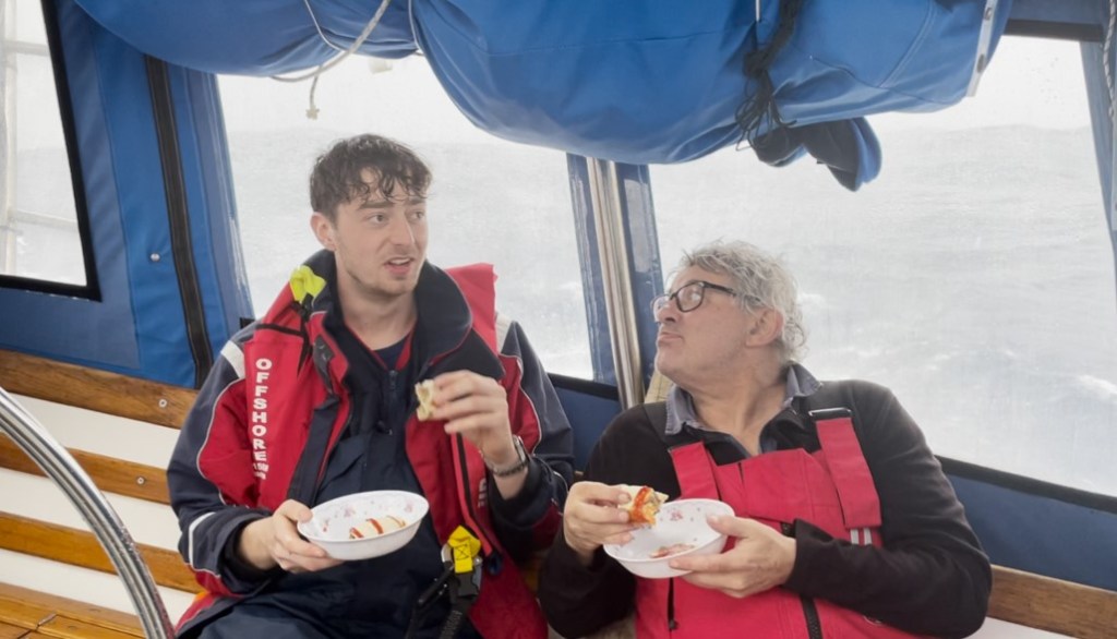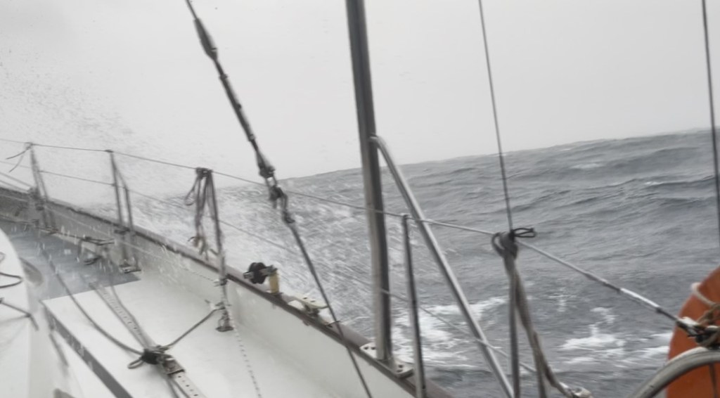 Two hours later, I was woken – by noises outside – to something akin to a parallel universe. No more the tranquility of bliss, Chimere was now bucking and flapping, with the howling sound of the wind and the unmistakeable splashing of waves raising me from my bunk and into the “suiting up” processes.