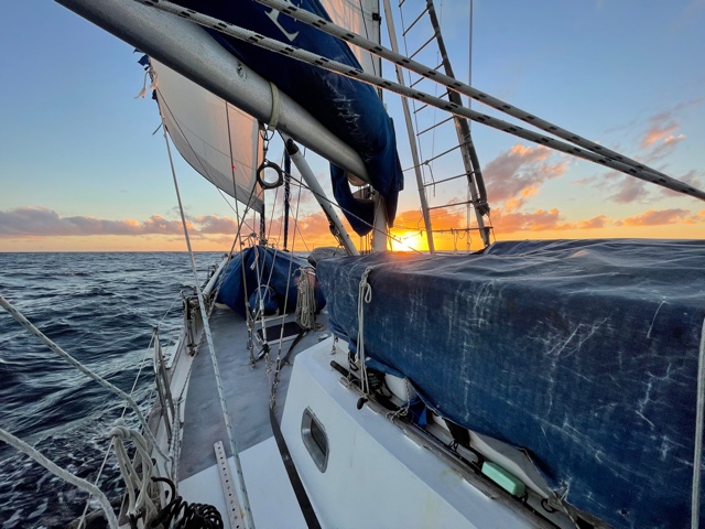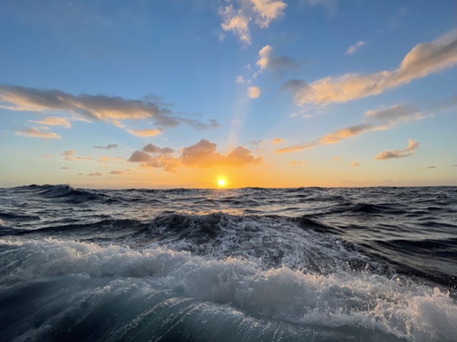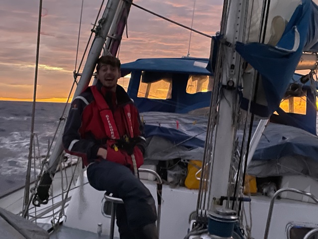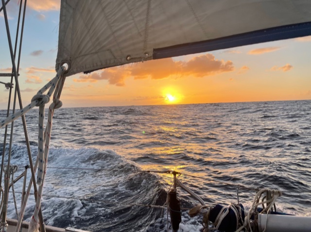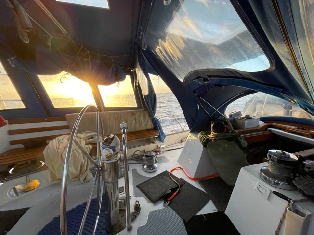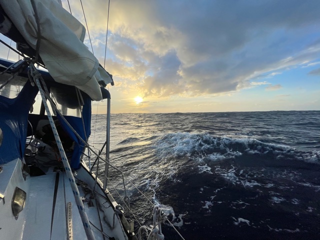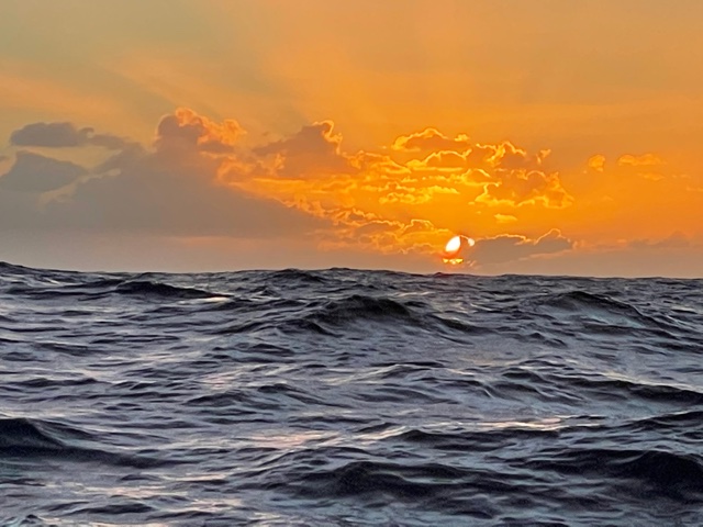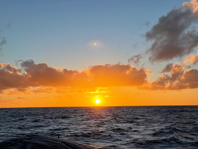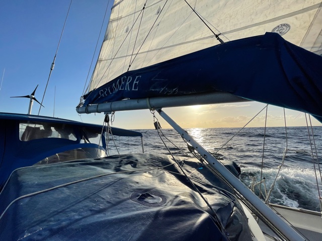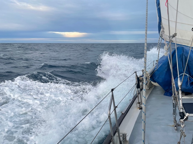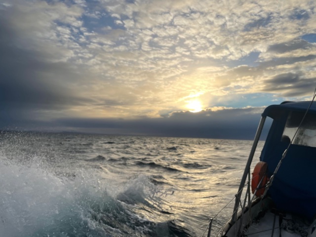 It’s now dark again, the sun has left us for another day, and whilst the westerly wind is sending us more south than our chosen course of WEST, the seas are relatively calm, we are making good time under sail alone and there’s a promise the wind will veer to the north west in a few hours – enabling us to creep our course to the right.