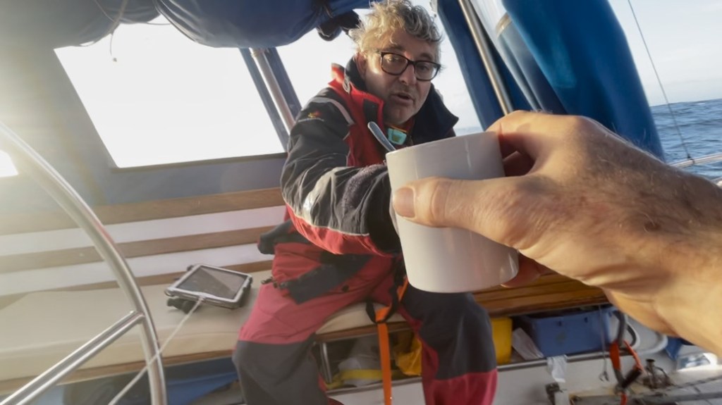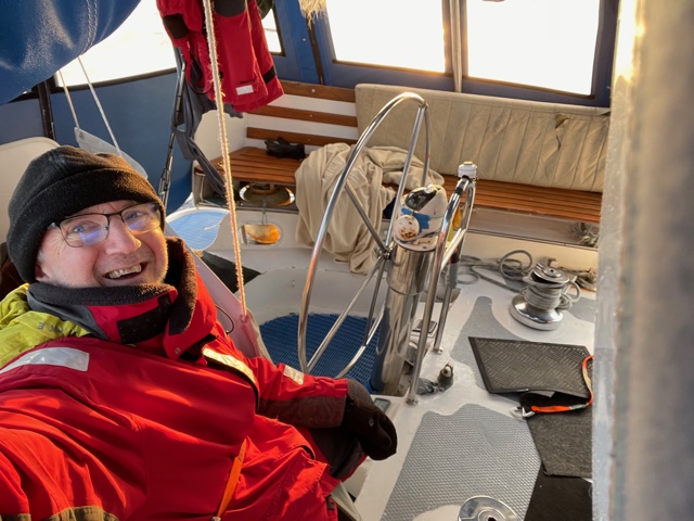 And by the sounds, this was no poke your head out of the companionway hatch with the kindly words … “how’s it going chaps?” … no, this was the full deal … thermals, polar fleece, super-socks, over-pants, sea boots, jumper, scarf, over-jacket, gloves, life jacket and tether-clip-on-strap … which I swear, will be the death of me! Oh, did I mention that you’d first better remember to go to the toilet before starting all of the above – even if you don’t think you need to – because up on deck you’ll regret it pretty soon.